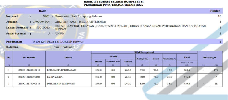Pengumuman Hasil Seleksi Kompetensi Pra Sanggah Calon PPPK Jabatan Fungsional Teknis Formasi 2022 27 April 2023