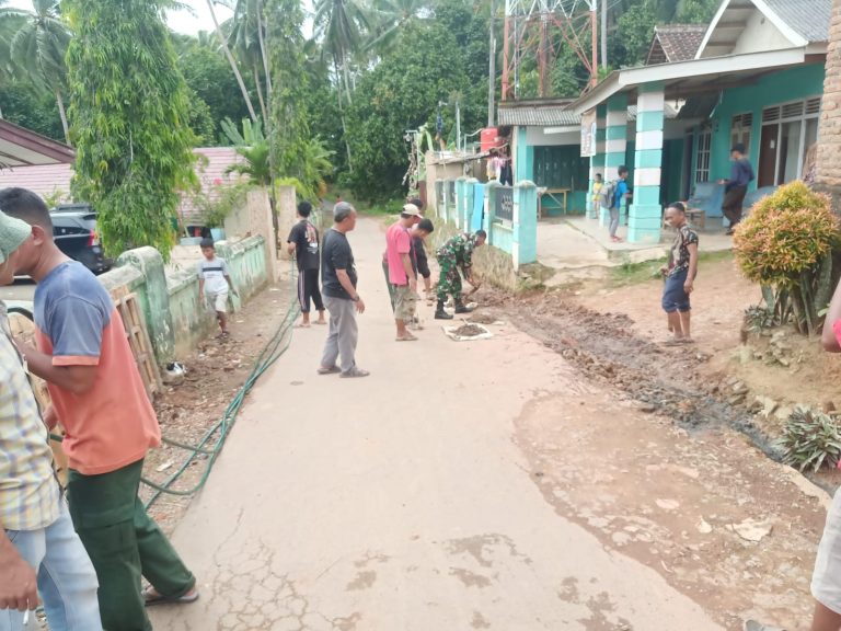 Cegah Banjir, Babinsa Katibung Bersama Warga Gotong Royong Bersihkan Saluran Air