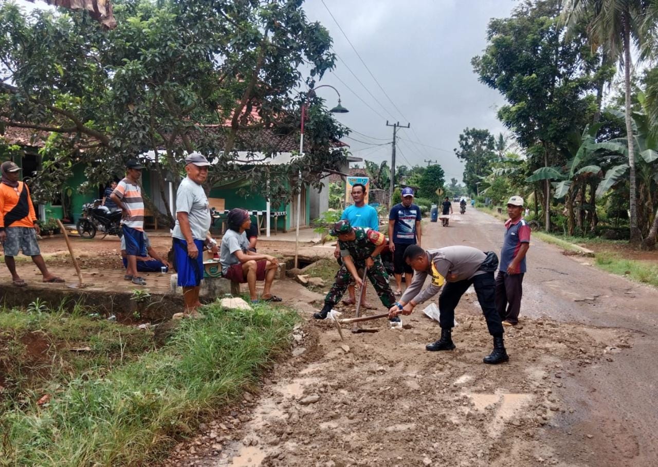 Hanuang.com – Babinsa Koramil Gedong Tataan Kodim 0421 Lampung Selatan (Lamsel) Serka Jono bersama bhabinkamtibmas dan warga masyarakat melaksanakan kegiatan kerja bakti gotong royong menimbun lubang-lubang di jalan menggunakan pasir batu, yang dilaksanakan dijalan Desa Pujorahayu, Kecamatan Gedong Tataan, Kabupaten Pesawaran, Senin, (12/6/23).