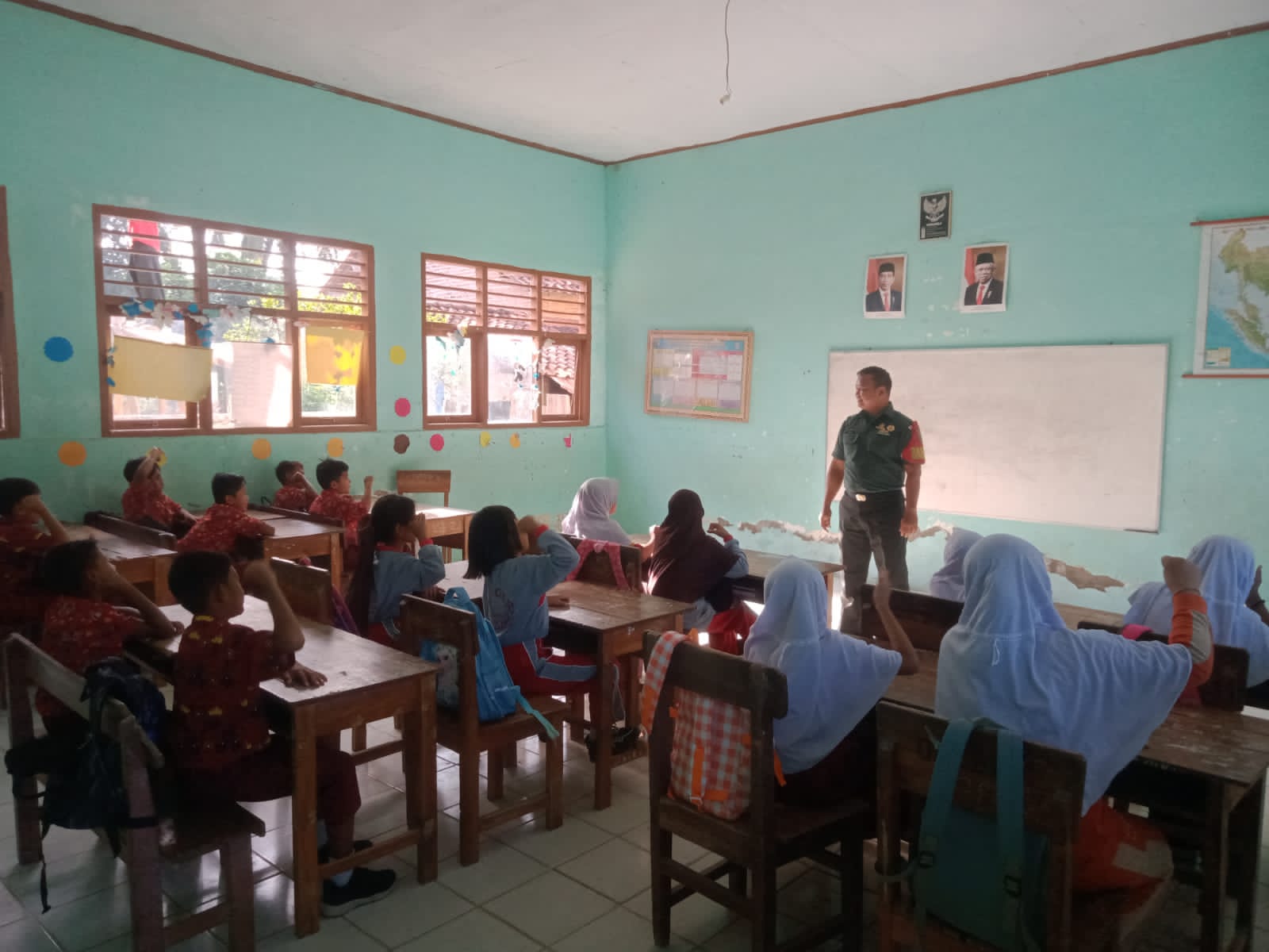 Bintara Pembina Desa (Babinsa) Koramil Kedondong Kodim 0421 Lampung Selatan (Lamsel) Koptu Robi Angkara, memberikan materi wawasan kebangsaan kepada pelajar kelas V SDN 3 Way Khilau, tepatnya di wilayah binaan Desa Kubu Batu, Kecamatan Way Khilau, Kabupaten Pesawaran, Kamis, (27/7/23).
