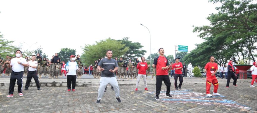 Hanuang.com – Bupati Lampung Selatan mengikuti kegiatan senam kebugaran jasmani yang berlangsung di halaman Gor Way Handak (GWH), Jumat (11/3/2022).