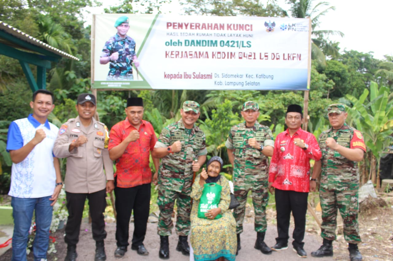 Hanuang.com – Komandan Kodim 0421 Lampung Selatan Letkol Inf Fajar Akhirudin, menyerahkan kunci rumah hasil bedah Rumah Tidak Layak Huni (RTLH) kepada Sulasmi yang berada di Desa Sidomekar, Kecamatan Katibung, Kabupaten Lamsel, Jumat, (26/5/2023).