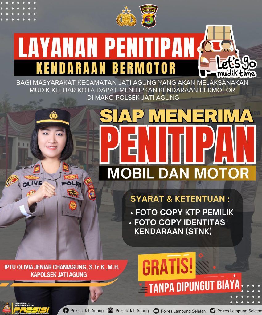 Hanuang.com – Menyambut musim mudik Lebaran 2024, Polsek Jati Agung Polres Lampung Selatan (Lamsel) mengumumkan layanan penitipan motor gratis bagi masyarakat yang akan melakukan perjalanan mudik.