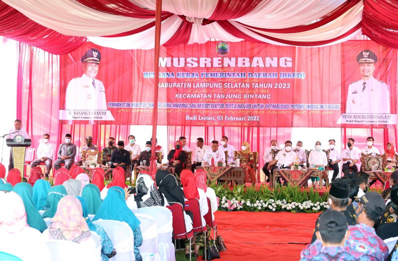 Memasuki hari ketiga, pelaksanaan Musrenbang digelar di Kecamatan Tanjung Bintang. Kegiatan yang berlangsung di Lapangan Karya Bhakti Desa Budi Lestari itu, dibuka langsung Bupati Lampung Selatan H. Nanang Ermanto, pada Kamis pagi (03/02/2022).