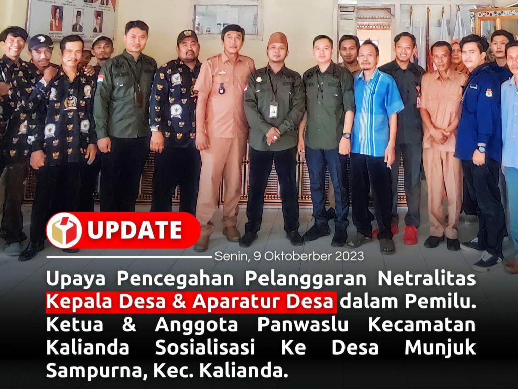 “Dalam rangka Pencegahan Pelanggaran Netralitas Kepala Desa, Aparatur Desa dan Perangkat Desa, Kami turun ke Desa – Desa berdasarkan Pemetaan Wilayah Desa Rawan Pelanggaran Netralitas, kali ini kami berkunjung ke Desa Munjuk Sampurna untuk melakukan sosialisasi terkait pentingnya menjaga Netralitas Kepala Desa dan Seluruh Perangkat nya agar terciptanya Iklim Demokrasi yang Sehat dan Berkeadilan” tutupnya.