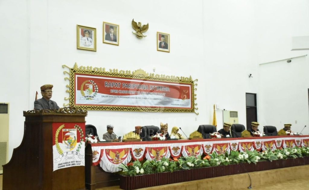Hanuang.com – Drs. M. Firsada sampaikan Capaian Prestasi yang telah diraih oleh Kabupaten Tubaba pada Rapat Paripurna Istimewa Memperingati Hari Ulang Tahun Kabupaten Tubaba Ke- 15, di Ruang Paripurna DPRD setempat, Rabu (03/04/24).
