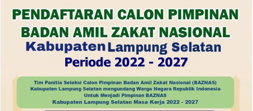 Hanuang.com – Pemerintah Kabupaten Lampung Selatan melalui Panitia Seleksi Calon Pimpinan Badan Amil Zakat Nasional (BAZNAS) Kabupaten Lampung Selatan membuka Pendaftaran Seleksi Calon Pimpinan Badan Amil Zakat Nasional Kabupaten Lampung Selatan periode 2022-2027.