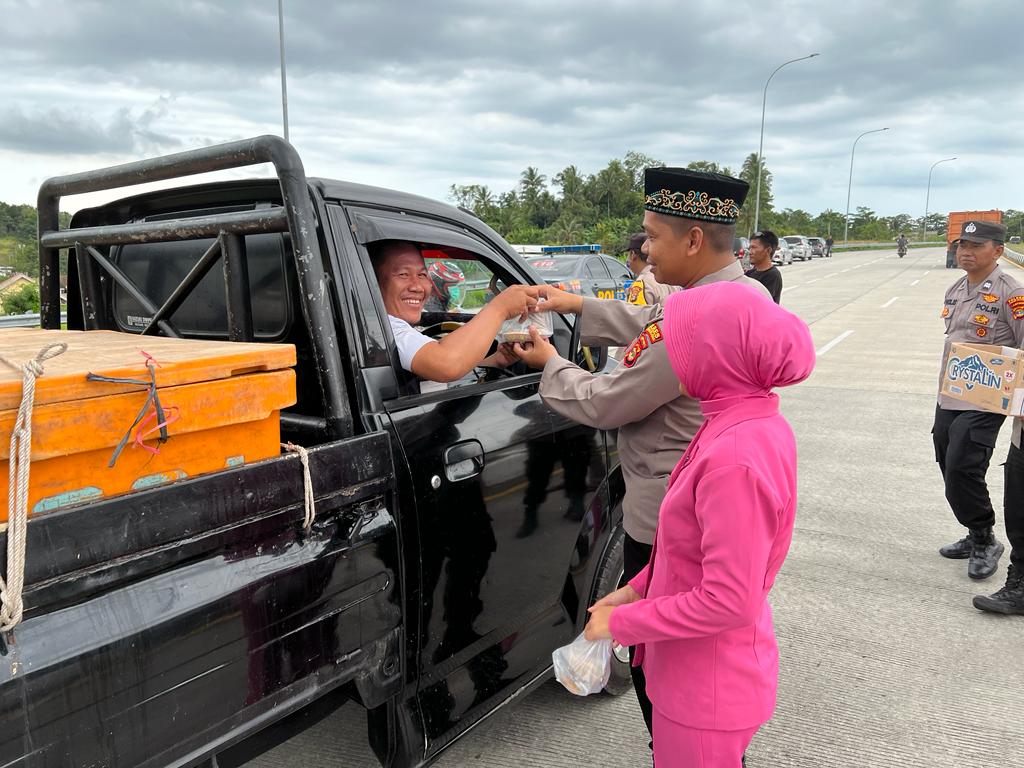 Kapolsek Penengahan IPTU Gobel mewakili Kapolres Lampung Selatan AKBP Edwin mengatakan, kami bersama dengan ibu Bhayangkari Polsek Penengahan beserta Awak media lakukan kegiatan bagi takjil gratis untuk pengguna jalan yang melintas di area Exit Tol Bakauheni Utara, Lampung Selatan.