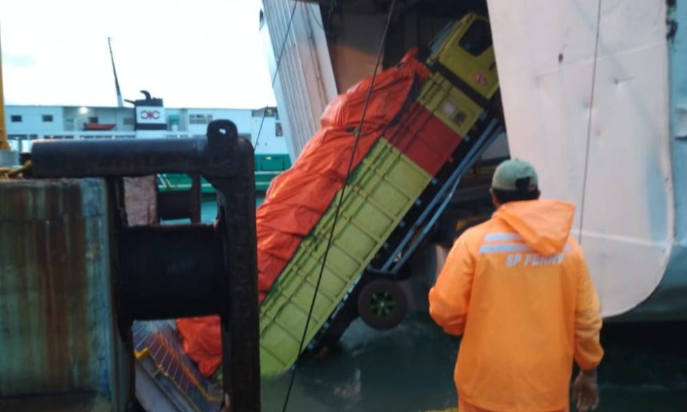 Hanuang.com – Truk Fuso dengan Nopol B 9052 F bermuatan rongsokan tercebur ke laut, setelah ramdoor KMP Nusa Putra Patah, Kamis, (27/12/18).