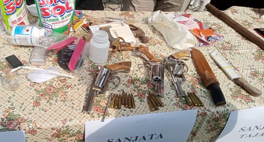 “BB yang dimusnahkan terdiri dari 99 potong baju dan celana, 23 unit handphone, 4 pucuk senjata api rakitan, 3 buah senjata tajam, bantal, 2 buah kasur, 15 butir amunisi, 26.3266 gram narkotika jenis sabu, 7 butir extacy, 5 buah timbangan digital, 14 buah stempel, 16 botol dan 396 butir pil heximer, serta 10 set kartu remi,” jelas perwira dengan balok kuning tiga dipundaknya.