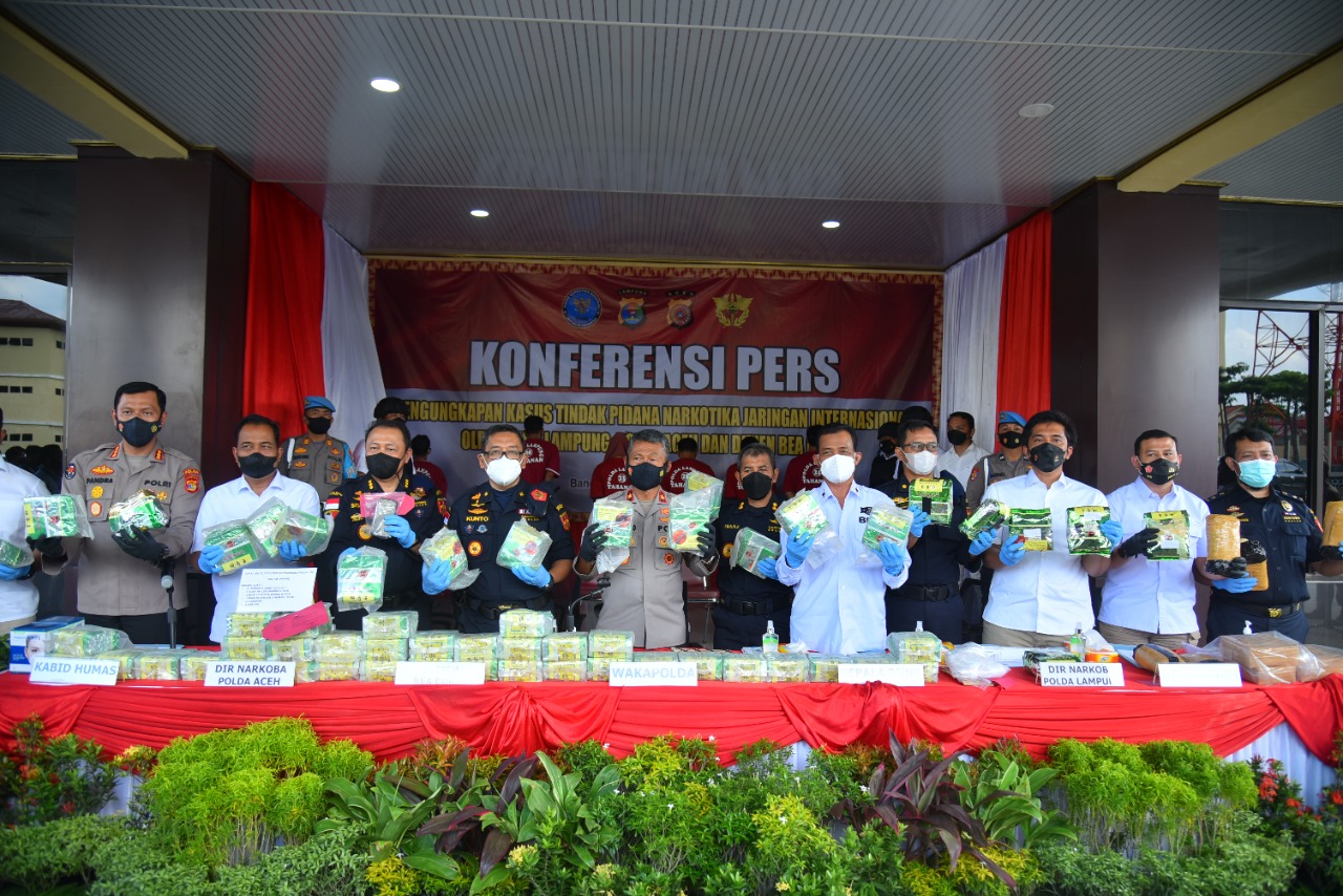 Kepala BNNP Lampung, Brigjen Pol Edi Swasono saat Konferensi pers mengatakan, sangat mengapresiasi kerja gabungan antara Polda Lampung, Polda Aceh dan Bea cukai, hingga berhasil mengungkap peredaran Narkoba jaringan internasional ini.