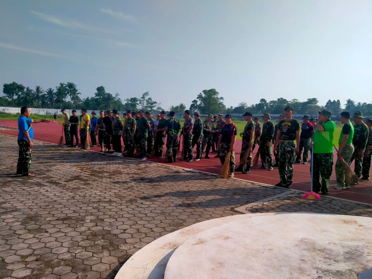 Suasana pagi yang cukup cerah, personel satuan Kodim 0421 Lampung Selatan (Lamsel), dibawah pimpinan Kapten INF Tarekat, selaku perwira seksi operasi melakukan pembersihan disekitar stadion guna penyiapan ajang liga santri tersebut, Sabtu, (18/06/2022).
