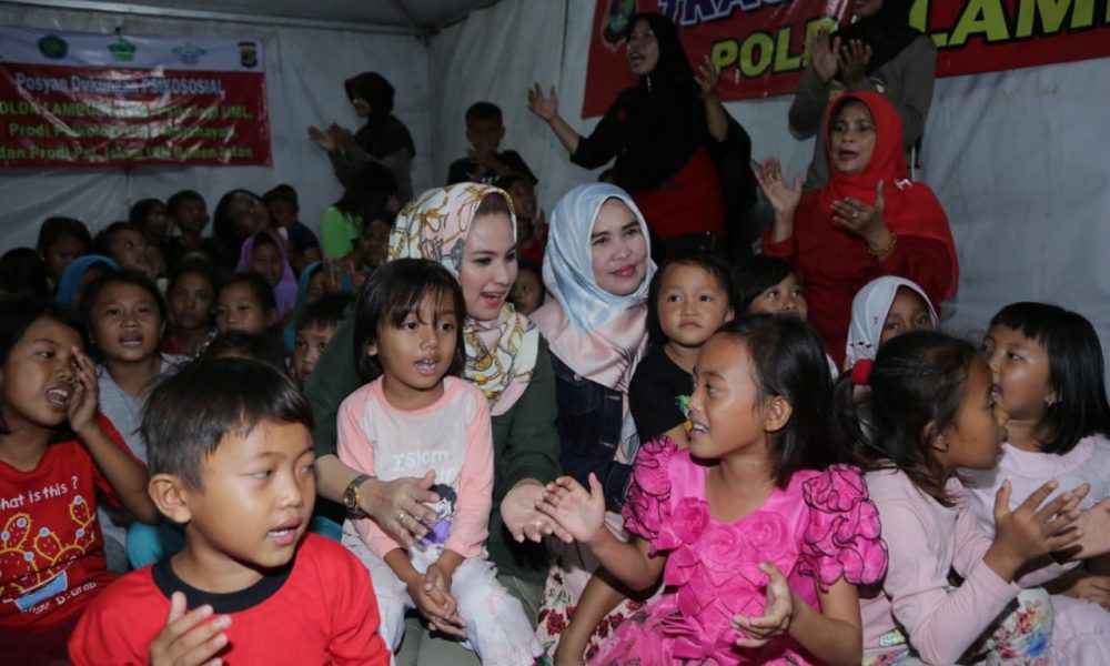 Hanuang.com – Ketua Tim Penggerak PKK Lampung Selatan (Lamsel), Winarni Nanang mendampingi istri Gubernur Lampung, Yustin Ridho Ficardo mengungjungi para pengungsi dari Pulau Sebesi dan Pulau Sebuku di Lapangan Tenis Indoor, Kalianda, Minggu malam (30/12/2018).